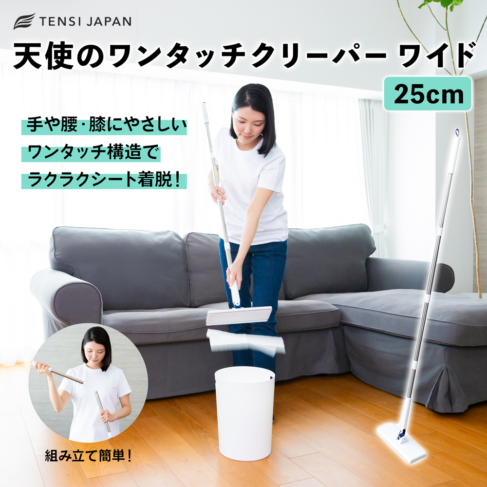 膝・腰・手にやさしい。使う人想いのフロアワイパー 毎日の掃除を少しでもラクにしたい方へ。「天使のワンタッチクリーパー」は、片手でシートの着脱ができるワンタッチ仕様で、自立式だから置き場所も省スペース。使う人の負担を減らす工夫が詰まった、やさしさ設計のフロアワイパーです。