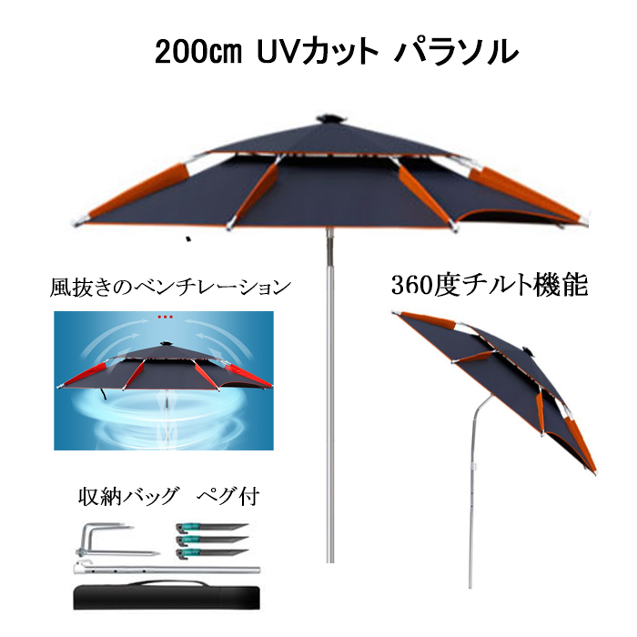 パラソル 釣り キャンプ 海水浴 大型 200cm 2重構造 角度調整 チルト UVカット ビーチパラソル ガーデンパラソル アウトドア