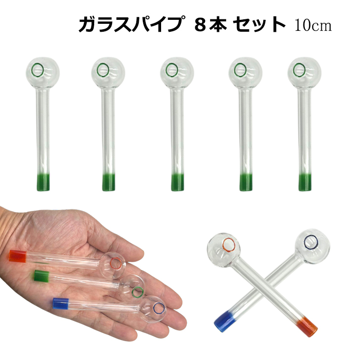 ガラスパイプ 8本セット カラー 長さ 10cm 球径 2.5cm ハッカパイプ メンソール 耐熱ガラス ガラスオイルバーナー 喫煙具 煙管 キセル
