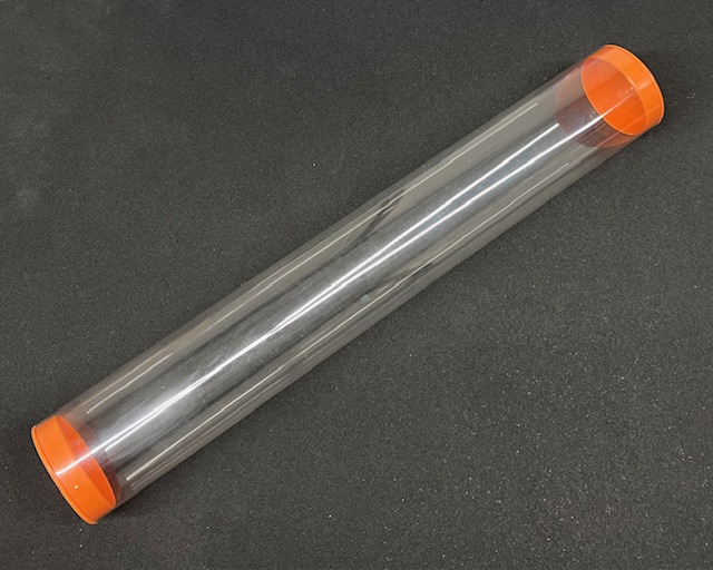 透明ブチレイト製のチューブ型ケースです。上下に蓋(オレンジ色)がつきます。チューブサイズ直径:約 75mm肉厚:約 0.5mm長さ:約 500mmアウトレット品の為、細かい傷がございます。ご了解の上ご購入ください。