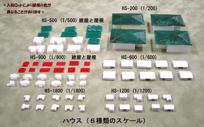 材質:スチレン樹脂形:画像を参照下さい。カラー:白・赤・緑です。7棟入りスケール:1/500サイズは【高さ9.5mm・縦横25.4 x 17.5mm】です。