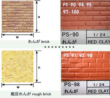 パターンシート:レンガ(brick) ・ 粗目レンガ(rough brick) 材質:スチレン樹脂カラー:画像を参照下さい。但し、入荷ロットによって色の変更や色の濃淡の相異があります。・PS-100は クレーレッド(赤茶色) ないし ホワイト(白色) です。*下の選択肢より商品を選択下さい。【サイズ】(縦×横)mm:175×300厚み:0.5mm