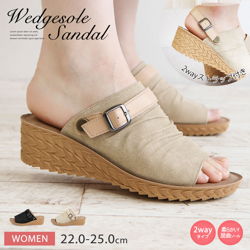 位置を変えられる2WAYストラップ付きで、シーンや気分に合わせてアレンジ自在。サッと履きたいときはミュールとして、しっかり動きたいときはバックストラップ付きサンダルとして使用できます。