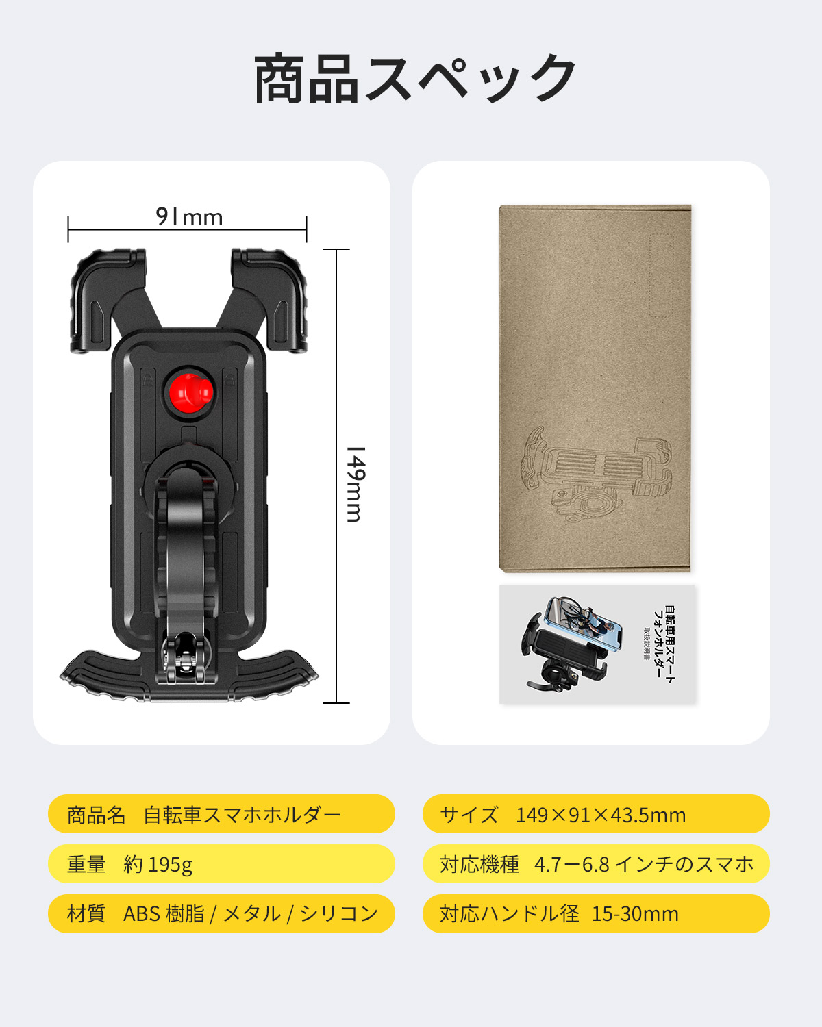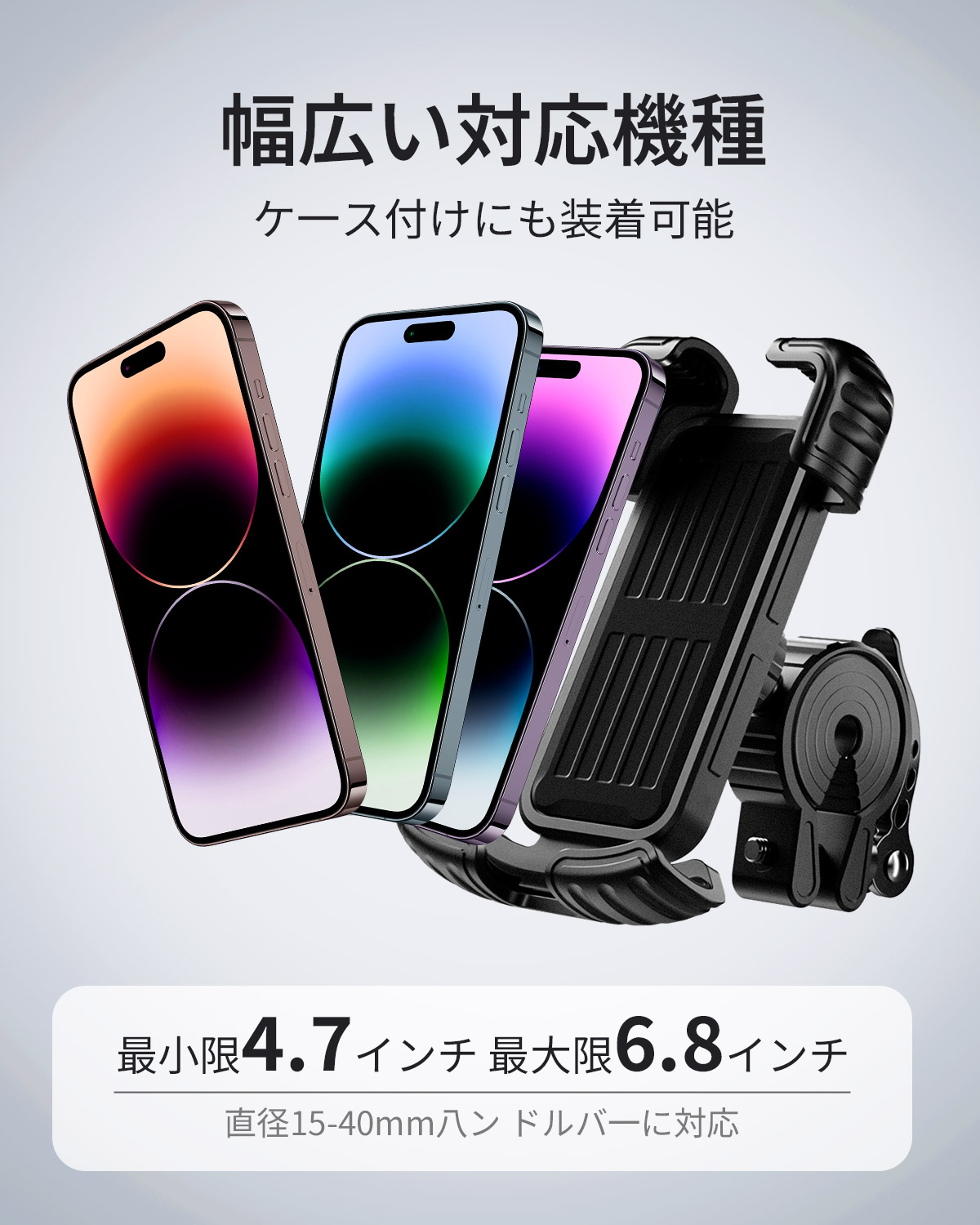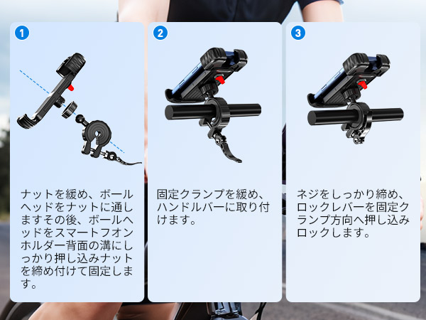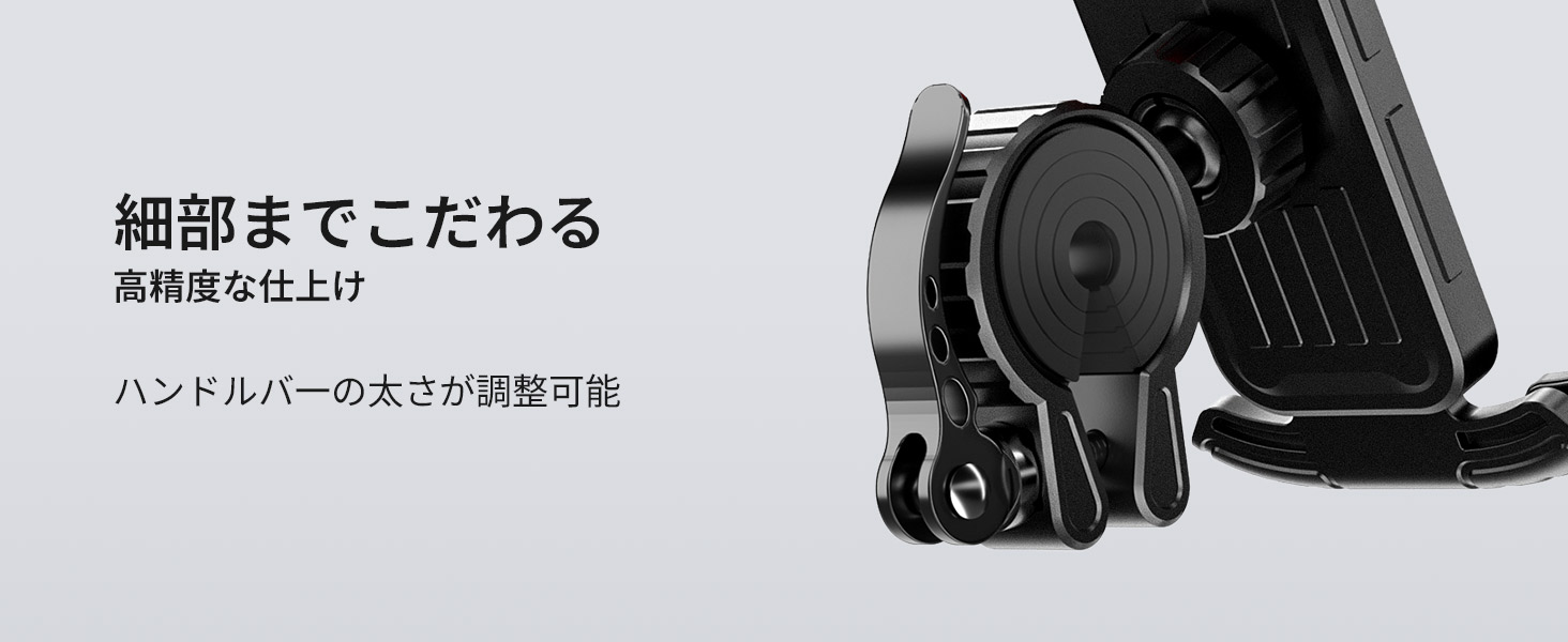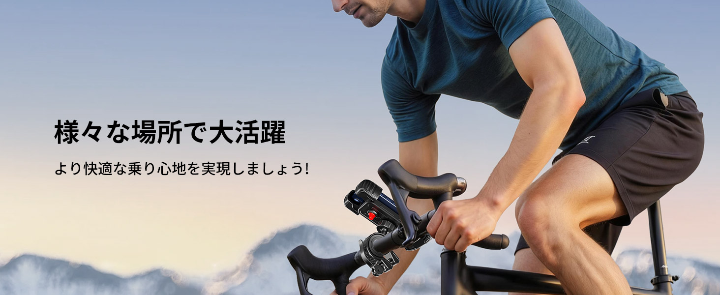【360 度回転でき&落ちない】自転車用スマホホルダーは平面 360 度回転可能、及び小範囲で俯仰角度を調整できます。視野角や角度を自在に変え、最適な角度でスマホをガッチリ固定し、ライディング中の安定感が抜群で脱落リスクゼロです!前置カメラやイヤホンジャックなどへのアクセスを妨げず、着信や自身のライディング姿を捉える自撮り、指紋認証、顔認証機能などもスムーズに使用できます。強力なクランプ構造と底部脱落防止レバーの二重保護、加えて振動吸収設計により、悪路走行時の強烈な振動や急なカーブでもスマホがガタついたり飛び出したりすることはなく、画面ブレの心配なくクリアな自撮りや動画記録が簡単に実現!走行しながらカメラで自身のライディング風景を記録したり、家族とリアルタイムで旅の様子を共有したりしましょう!【1sで快速に取付&片手着脱可能】頑丈で連動式のアームにより、面倒な操作はなく、片手でスマホを取付け・取外します。両側のレバーを押すとアームが自動的に伸び、スマホをホルダーに入れて底部に軽く圧を加えると、アームが自動的に収縮し、しっかりと端末をクランプします。その為に、ライディング中に、いつでもスマホを取り外して、モバイル決済したり、撮影したりすることができます。【振動吸収マット、安定感アップ】スマートフォンをガッチリと固定することで、走行中でも落下の心配はありません。携帯ホルダー表面の発泡コットンがつき、防音防水で、耐衝撃性を向上させます。厚いゴムマット付きで、滑り止めと同時に摩耗を抑えます。ホルダーは挿入により固定タイプで、底部のレバーがスマホの落下を防止できます。強烈な振動でも携帯が落ちない、スマホホルダーも揺れない。様々な道路状況に適し、非常に安定で頑丈です。【高品質素材・高精度な仕上げ】ABS樹脂製ボディーが優れた靭性を持っているため、携帯を効果的に保護できます。どんな状況でもスマホの安全性を確保し、走行中にスマホが飛び出すことなく、大切なスマホを擦り傷からガッシリと守ります!それとともに、抗老化性及び耐紫外線性は一般のプラスチックより優れており、耐久性は他のスマホホルダーよりよいです。【幅広い互換性!多車種対応&多機種に対応】スマホのグーグルマップでナビを使用しながらライドを楽しめます。スマホのグーグルマップでのナビゲーションや様々なシーンでの利用に適しています。バイク、オートバイ、ロードバイク、マウンテンバイク、モーター、電動バイクなど様々なハンドルに対応し、直径約17〜35mmのハンドルバーに取り付け可能。スマホの幅が約4.7〜6.8インチ、厚さが15mmまで対応しています。購入前にご使用の端末に適合するかをご確認ください。商品がお手元に届いた時に破損など或いは使用中に何か問題がありましたら、いつでもお気軽に連絡いただきます。