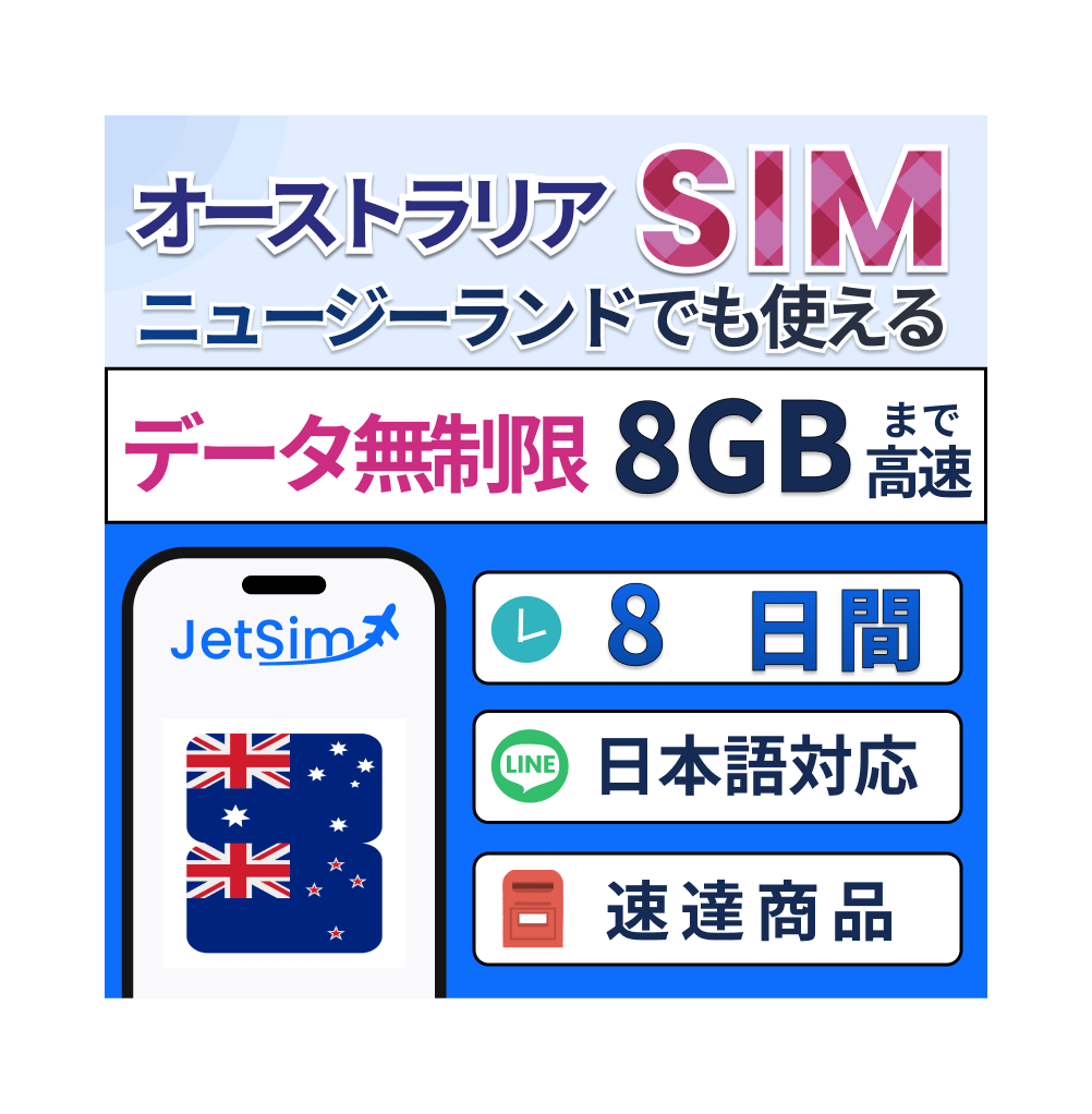 【オーストラリア/ニュージーランド物理SIM】8日間 8GB 高速データ 1日1GBまで高速 データSIM プリペイドSIM ジェットシム テザリング可 5G/4G-LTE