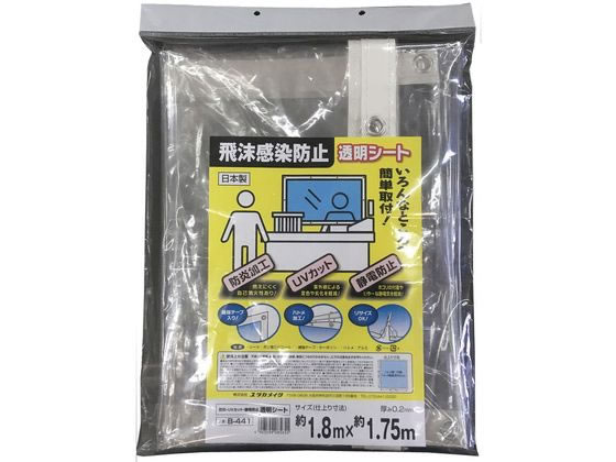 【商品説明】防止用の間仕切りシートとして。防炎・UV劣化防止・静電防止を有しています。シート周辺はテープ補強+ハトメ付。ハサミやカッターでカットは自由に。【仕様】●サイズ:1.8m×1.75m●厚み:約0.2mm●ハトメ内径:9mm(#25アルミハトメ)●ハト目間隔:45cm●ハト目数:16●材質:PVC●パッケージサイズ:縦440×横240×奥行40mm <ジェットプライス>