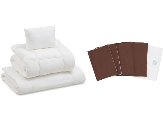 【仕様】●カラー:ブラウン ●シングル ●セット内容:掛け布団、敷き布団、枕、掛け布団カバー、敷き布団カバー、枕カバー2枚、除湿シート、収納バッグ【掛け布団】/商品サイズ(約):1500×2100mm、主要材質:側生地:ポリエステル100%、詰めもの:ポリエステル100%、目付け(約):80g/m2、詰めもの重量(約):1.1kg 【敷き布団】商品サイズ(約):1000×2100mm、主要材質:側生地:ポリエステル100%、詰めもの:ポリエステル100%、目付け(約):80g/m2、詰めもの重量(約):固わた1.3kg、巻きわた1.7kg 【枕】商品サイズ(約):350×500mm、主要材質:側生地:ポリエステル100%、詰めもの:ポリエステル100%、目付け(約):80g/m2、詰めもの重量(約):350g 【掛け布団カバー】商品サイズ(約):1500×2100mm、主要材質:ポリエステル100%、目付け(約):80g/m2、カバー取り付けひも:4か所 【敷き布団カバー】商品サイズ(約):1050×2100mm、主要材質:ポリエステル100%、目付け(約):80g/m2 【枕カバ