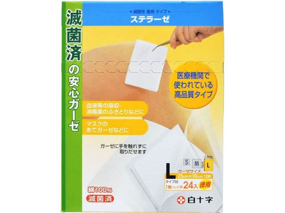 【商品説明】1枚づつ個包装、滅菌されているので傷口にも安心のガーゼです。滅菌バッグから取り出し、すぐにお使い頂けます。このガーゼは、医療現場でも使用されている実績のある商品です。綿100%ですので、デリケートな肌にも安心してご使用いただけます。使いやすい大きさに裁断したソフトな家庭用常備綿です。【仕様】●内容量:24枚●サイズ:L(7.5cm×10cm/12折)●個包装●滅菌済 【一般医療機器】 【届出番号】13B2X00023000011 [生産国:中国 商品区分:一般医療機器 メーカー:白十字株式会社 広告文責:フォーレスト株式会社 0120-40-4016] <ジェットプライス>