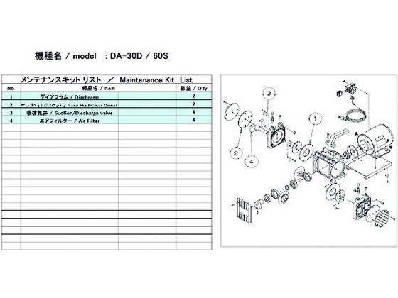 【商品説明】●ダイアフラム型ドライ真空ポンプのメンテナンスに必要な消耗品を揃えたセットです。●修理時に通常交換するダイアフラム、吸排気弁などの部品セットです。【仕様】●型番:DA-30D/60S MAINTENANCEKIT ●適合機種:DA−30D、DA−60S ●ダイアフラム×2、ヘッドガスケット×2、吸排気弁×4、エアーフィルタ×4 <ジェットプライス>