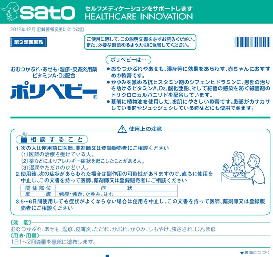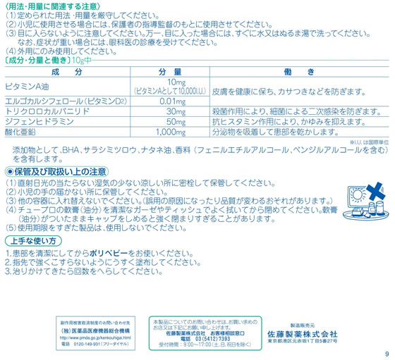 かゆみを鎮める抗ヒスタミン剤のジフェンヒドラミンに、患部の治りを助けるビタミンa、d2、酸化亜鉛、そして細菌の感染を防ぐ殺菌剤のトリクロロカルバニリドを配合しています。
