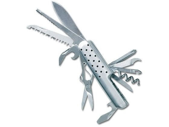 【商品説明】よく使うツールをこれ1本で携帯!ステンレス製でサビにくい!【仕様】●外形寸法:約H76×D19×W23(mm)●重量:約73g(キーホルダー含まず)●主な材質:本体 ツール/ステンレス、持ち手/アルミ、キーホルダー/亜鉛合金、ニッケルメッキ●セット内容:[1]ナイフ/[2]針はずし/[3]ウロコ取り/[4]ノコギリ/[5]缶切り/[6]ハサミ/[7](−)ドライバー/[8]栓抜き/[9]穴あけ/[10]コルク抜き/[11]ひも通し/[12]ヤスリ/[13]爪そうじ/[14](+)ドライバー <ジェットプライス>