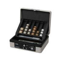 【商品説明】金銭の取り出しがスムーズな立て掛けコイントレーです。コイントレーを立て掛けることでコイントレーを持ち上げなくても庫内の収納物がすぐに取り出せます。コイントレーは各硬貨50枚収納でき、10枚ごとに区切りがあるので集計処理の時間も短縮できます。上蓋裏面のクッションで硬貨を押さえているので持ち運び時に生じる硬貨の飛散を防止します。トレー下は紙幣が折らずに入るフリースペースです。【仕様】●サイズ:(外寸)幅195×奥行155×高さ87mm、(内寸)幅164×奥行110×高さ27mm●重量:900g●材質:SPCC、ABS●施錠方式:錠前/ダイヤル錠●収納サイズ:A6サイズ●硬貨飛散防止●10枚区切りコイントレー●硬貨収納枚数:500円50枚、100円50枚、50円50枚、10円50枚、5円50枚、1円50枚●付属品:鍵2個●色:グレー●注文単位:1台 <ジェットプライス>