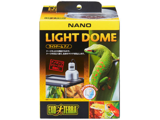 【商品説明】自然の太陽のように、ランプを上から照らすライトドーム。小型ケージにぴったりのサイズの照明器具。サングロー ナノ、ヒートグロー ナノランプを設置して、太陽光を再現し、昼夜のサイクルをつくる事で、生体が健康的に過ごせる環境に。ケージの上から照射することで、ケージ内を広く使え、生体やメンテナンス時のヤケドを防止します。【仕様】●対応商品:サングロー ナノ、ヒートグロー ナノ●製品サイズ:約幅10.1×奥行10.1×高さ12.5cm(コード部除く・カバー含む)●定格消費電力:25W●使用電球:爬虫類・両生類飼育用ランプ(白熱球110V 25W以下)●適用口金:E26●電源コード長:約1.7m(中間スイッチ含む)●使用方法:ご使用の前に本製品の取扱説明書の注意事項をよく読み、ケージ天面の金属メッシュの上に置いてください。※必ずカバーを取り付けて使用してください。※本製品は天面が金属製のメッシュになっている爬虫類・両生類飼育用ケージにのみご使用いただけます。落下の恐れがあるため、天面にフチのないケージには使用しないでください。 <ジェットプライス>