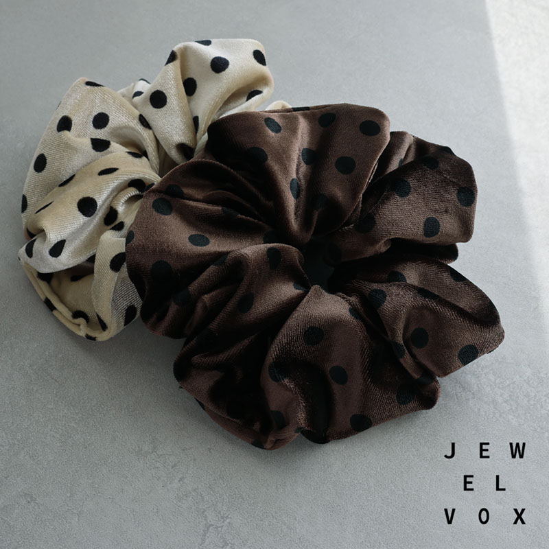 シュシュ ヘアゴム ヘアアクセサリー ドット 水玉 ベロア ベージュ ブラウン レディース まとめ髪 ヘアアレンジ 普段使い ファッション雑貨