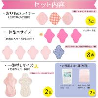 ・オーガニックおりものライナー×3枚 ・布ナプキン(一体型Mサイズ)×8枚 ・布ナプキン(一体型Lサイズ)×2枚 ・アルカリウォッシュ500g×1袋 ・防臭チャック袋Mサイズ×1枚 |
