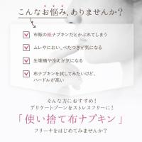| ・未縫製のため、洗って繰り返しのご使用はお控えください。本製品は水に流せません。トイレに捨てないようお願いいたします。使用後は使い捨てナプキンと一緒にエチケットボックスへ。 |