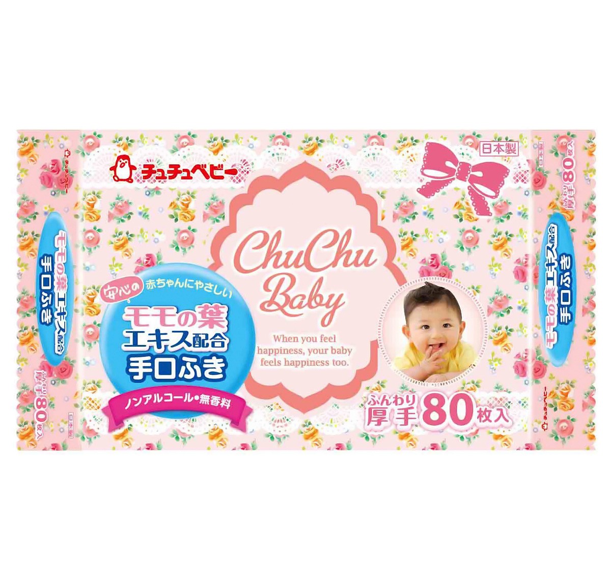 チュチュベビーの手口ふきはノンアルコールで無香料。モモの葉エキス配合のふんわり厚手です。コンパクトタイプなので持ち運びも便利です。お肌に優しいソフトで厚手対応の不織布が綺麗に汚れをふき取るウェットシートです。水が主成分だから赤ちゃんのお肌に安心してお使いいただけます。詰め替えの要らない、1枚ずつ簡単に取り出せるティッシュタイプ。