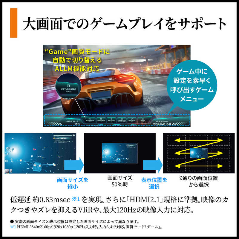 ●低遅延 約0.83msec※を実現し、大画面テレビでのゲームプレイをサポート。 ※4K 120Hz、2K 120Hzの映像入力において画質モード「ゲーム」時のパネル表示を除く内部信号遅延量。