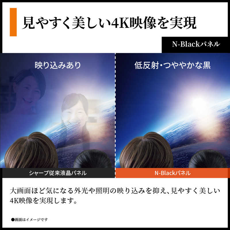 ●外光や照明の映り込み抑えながら、艶やかな黒を実現する「N-Blackパネル」を搭載。