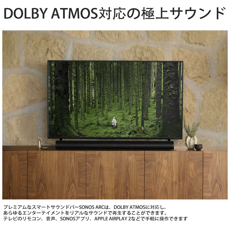 プレミアムなスマートサウンドバーSonosArcは、DolbyAtmosに対応し、あらゆるエンターテイメントをリアルなサウンドで再生することができます。テレビのリモコン、音声、Sonosアプリ、AppleAirPlay2などで手軽に操作できます。