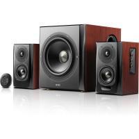 仕様 総出力: RMS 15W*2+25W*2+70W 信号対ノイズ比: R / L: ? 80dB (A) ; SW: ? 85dB フリーケンシーレスポンス: R/L: 160Hz -20KHz; SW: 40Hz ?160Hz 入力感度: PC : R/L: 600±50mV ; SW: 270±20mV;AUX: R/L: 400±50mV; SW: 200±20mV; Optical/Coaxial: R/L: 400±50mFFS; SW: 200±20mFFS; Bluetooth: R/L: 400±50mFF; SW: 200±20mFFS 入力: PC、AUX、Bluetooth、光、同軸 ベースドライバ: 3,5” Base+8” SW トレブルドライバ 3/4インチチタントップトレブル サイズ [スピーカー毎]: 24.1in x 14.2in x 14.3in アクティブ/パッシブ: アクティブ リモコン: ? 十分な機能を有するブックシェルフスピーカー 多くの2.1システムが小さなサテライトスピーカーを搭載しており、サブウーファーでサテライトからの小さな音を補います。S350DBを使用する事で、圧倒的なサブウーファーと十分な機能を有するブックシェルフスピーカーの両方を得る事が出来ます。あなたの発信元を、Bluetooth、RCA、光入力、同軸入力あるいはAUXでこれらのスピーカーに接続して下さい。 サイドパネルコントロール ブックシェルフスピーカーの一方の側面についているサイドパネルコントロールで、オーディオを簡単に操作する事が出来ます。側面には3つの取っ手がついており、2.1システムの低音、高音そして音量を調節出来ます。電源が入ると、電源ライトが点灯しシステムが作動している事が分かります。 ワイヤレスリモートコントロール S350DB用のワイヤレスリモートコントロールで、入力端子の切り替えや再生装置のコントロールをして下さい。ある範囲から光入力、同軸入力、補助入力、そしてBluetooth入力の切り替えが出来ます。また、ワイヤレスリモートコントロールで音量や再生コントロールを操作したり、スピーカーの電源をオン・オフに切り替える事も可能です。 深みのある低音の為の8インチのサブウーファー 再生中に8インチのサブウーファーを作動させると、S350DBから響き渡る低音から大きな満足を得る事が出来ます。このサブウーファーを取り付けて音を出すと、映画、音楽、そしてゲームが活気付きます。 サイドパネルのバスレフ型ポート このサブウーファーは、強化されたサイドパネルバスレフ型ポートを搭載しています。このレフ型ポートは、タイプの低音のリスニング体験を向上させます。この2.1システムを使用して、あなたのお気に入りの映画や音楽、ゲームなどから深く響き渡る低音をお楽しみ下さい。