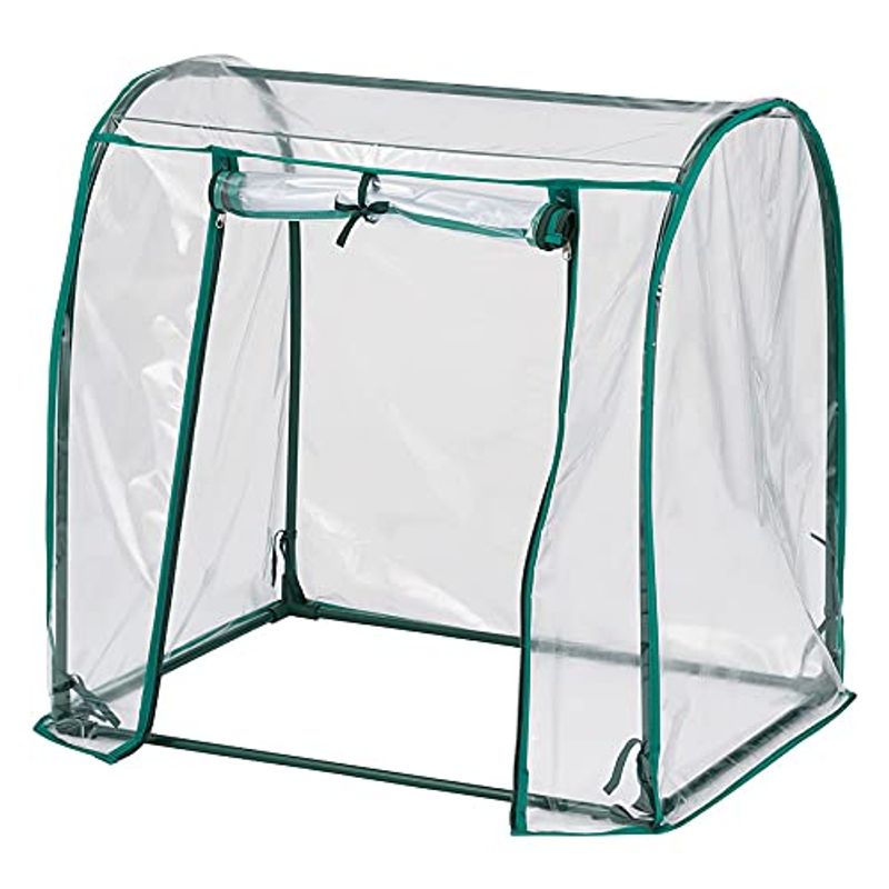 植物を風や虫から守るビニール温室 ドーム型です。鉢植えなどを出し入れする際、入口のカバーを巻上げ紐で固定することで、開けたままの状態で作業することができます。