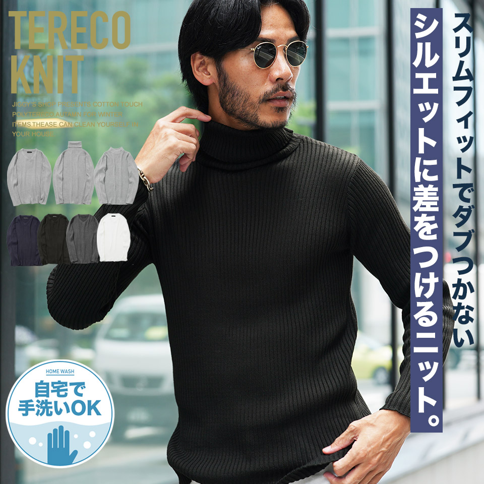 ニット セーター メンズ トップス リブニット テレコ編み 綿タッチ 選べる3タイプ Vネック モックネック タートルネック 長袖 秋 冬 春