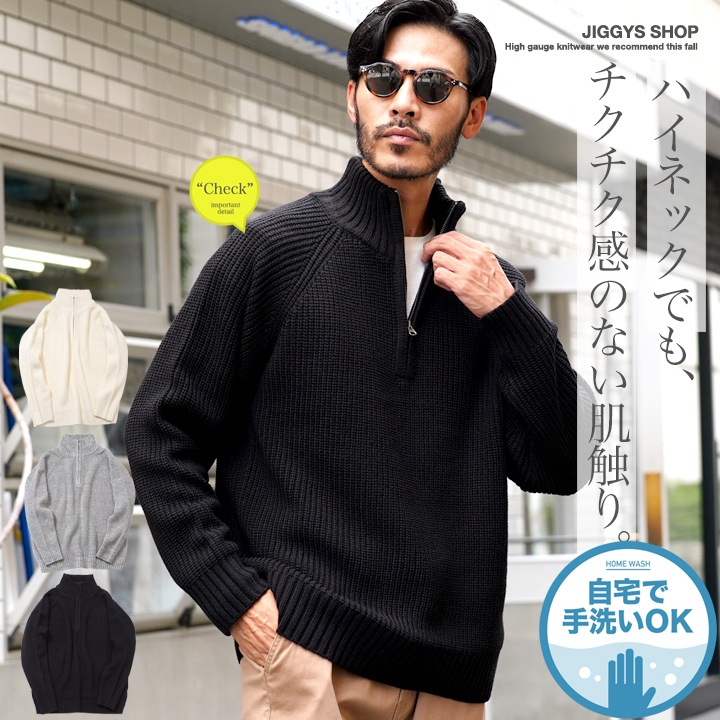 ニット セーター メンズ トップス ハーフジップ ZIP ドライバーズニット 洗えるニット ウォッシャブル あぜ編み 畦編み 秋 春