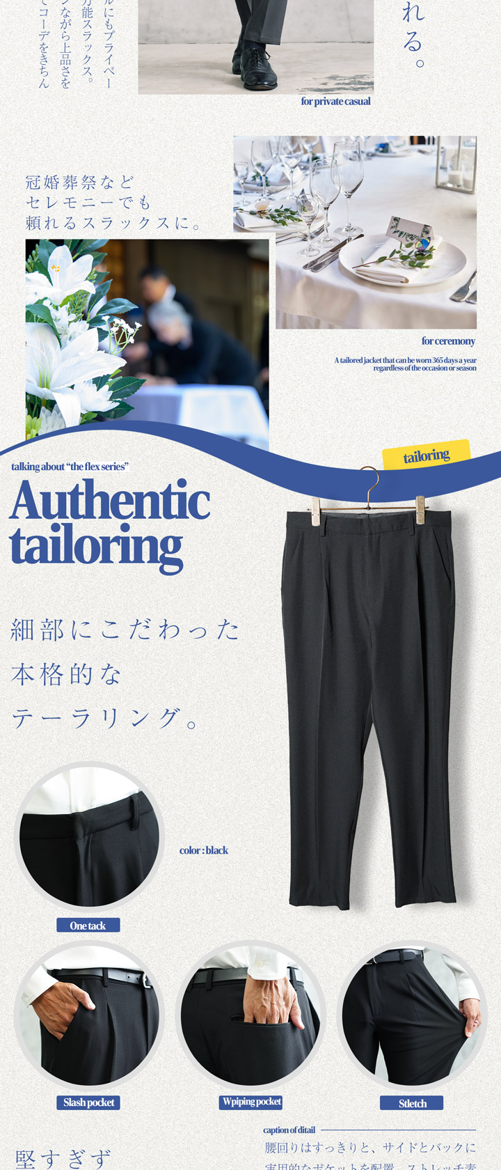 ストレッチ素材で快適さを保ちながら、テーパードラインで美しいシルエットを演出。