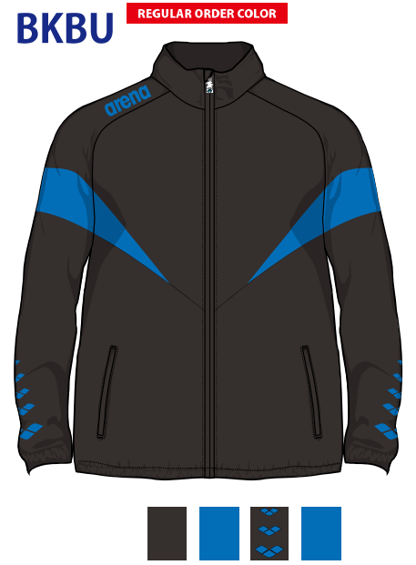 チーム用の布帛ジャケットです。ノーマル(レギュラー)シルエットでゆったり見えるパターンを採用しています。5連アリーナマーク使用デザインです。