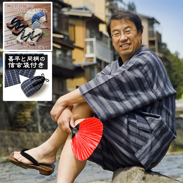 【和の伝統を重んじる自社生産の甚平作務衣の専門店が贈る】 5963(ごくろうさま)コース 抗菌消臭甚平+自社生産のお店だからこそ出来た 同素材の『信玄袋』+選べるお履物(はきもの)+柄は「おまかせ」扇子 こだわり抜いて、あなたの大切な人に送ります。 | ||||||
