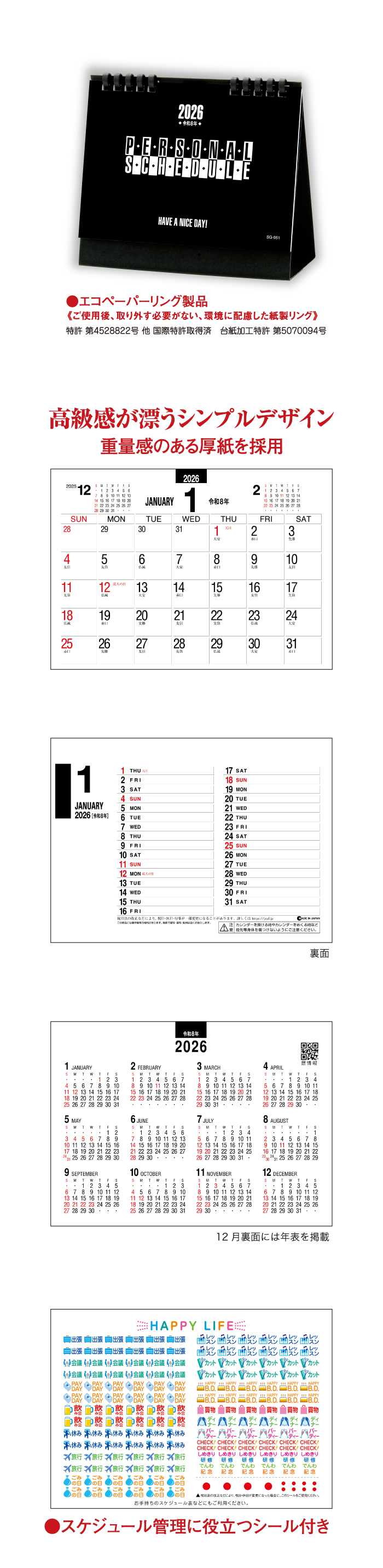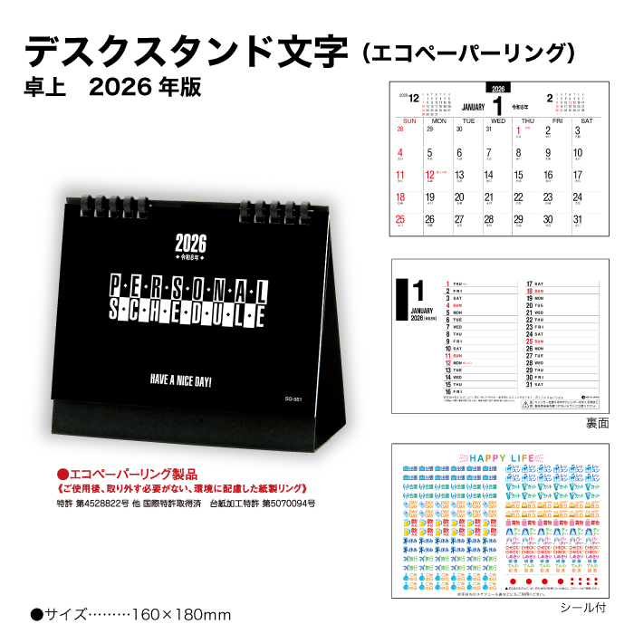 カレンダー 2026 卓上 デスクスタンド文字 SG951 デスクカレンダー カレンダー 2026 卓上 シンプル スケジュール シール ブラック 258235