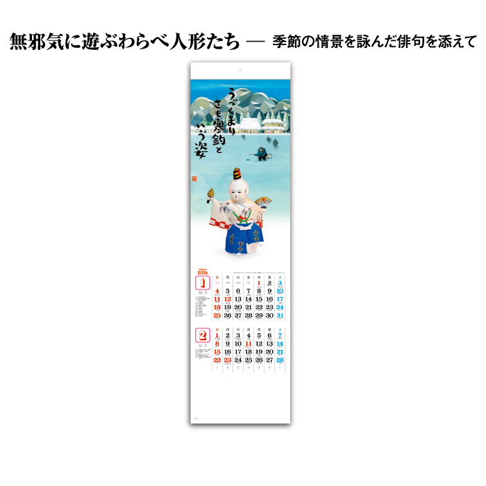 | 商品特徴 | ・無邪気に遊ぶわらべ人形が四季を彩る ・主要行事など生活に必要な知識が満載 ・季節にちなんだ俳句豊富なカレンダー ・カレンダーを綴る部分を金具ではなく、厚紙を使用しホットメルトという接着剤を使用した、環境に優しいエコカレンダーになります。 ・廃棄する時も分別の必要がない、手間もかからず環境にも配慮した商品です。 |