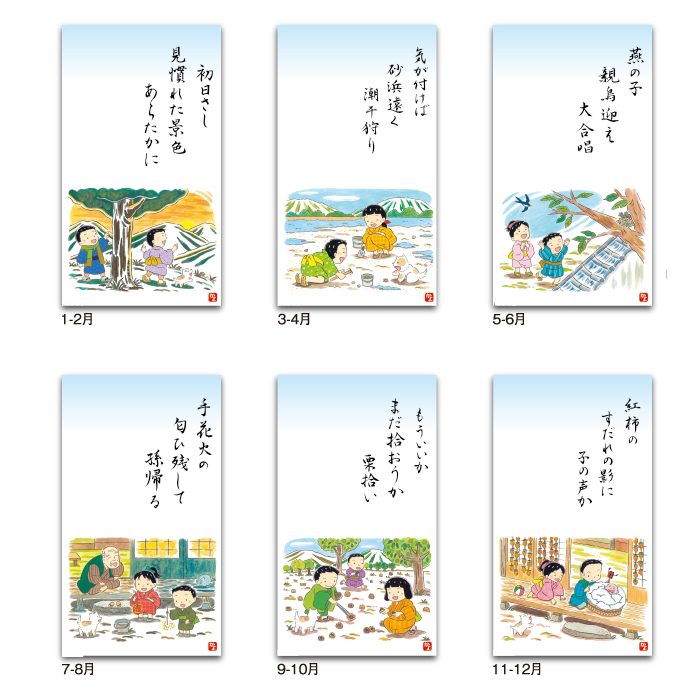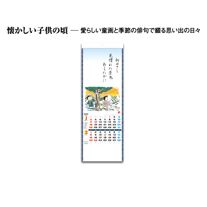 | 商品特徴 | ・愛らしい童画と季節の俳句で綴る思い出 ・暦の情報が満載 カレンダーを綴る部分を金具ではなく、厚紙を使用しホットメルトという接着剤を使用した、環境に優しいエコカレンダーになります。 廃棄する時も分別の必要がない、手間もかからず環境にも配慮した商品です。 |