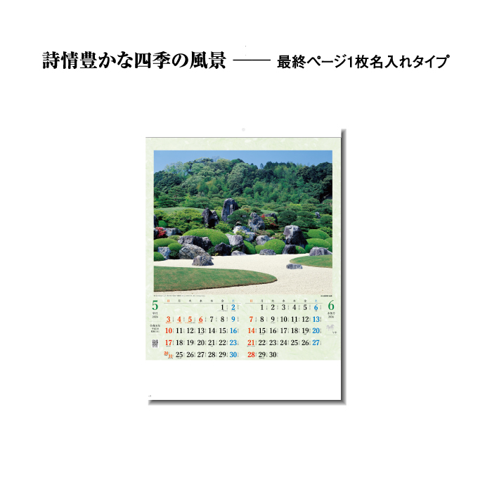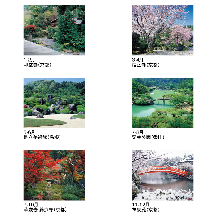 | 商品特徴 | ・日本の和の心である日本庭園の四季を収めたカレンダー ・四季折々の風景に癒されます。 ・表紙のない新しいタイプのカレンダーです。 カレンダーを綴る部分を金具ではなく、厚紙を使用しホットメルトという接着剤を使用した、環境に優しいエコカレンダーになります。 廃棄する時も分別の必要がない、手間もかからず環境にも配慮した商品です。 |