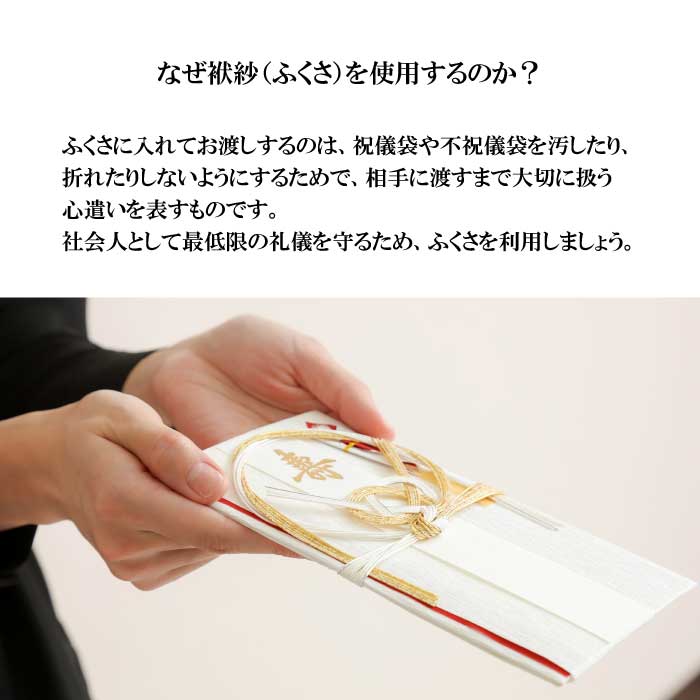 ふくさに入れてお渡しするのは、祝儀袋や不祝儀袋を汚したり、折れたりしないようにするためで、相手に渡すまで大切に扱う心遣いを表すものです。社会人として最低限の礼儀を守るため、ふくさを利用しましょう。