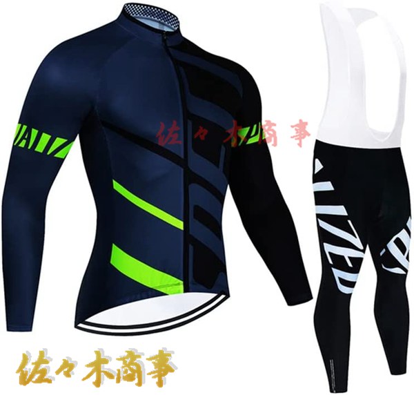 メイン素材:Polyester+Lycra;ジャージー:Polyester、パンツ:Polyester+Lycra、表面はポリエステル、裏面は起毛の素材を採用し、防風保温、通気性に優れる秋冬用サイクルジャージです