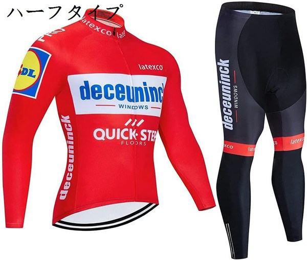 メイン素材:Polyester+Lycra;ジャージー:Polyester、パンツ:Polyester+Lycra、表面はポリエステル、裏面は起毛の素材を採用し、防風保温、通気性に優れる秋冬用サイクルジャージです