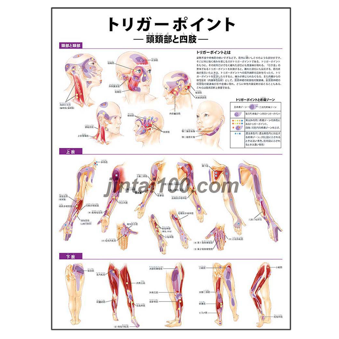 ポスター『トリガーポイント (頭頚部と四肢)』は、様々な角度から頭頚部と四肢のトリガーポイントと疼痛ゾーンを色別で図示しました。