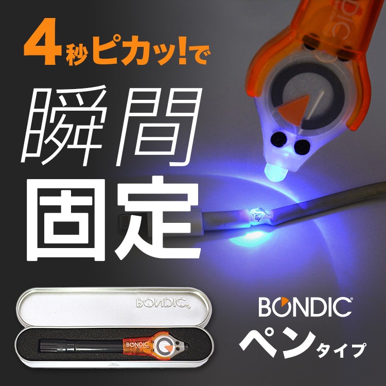 「BONDIC」(ボンディック)は世界初の紫外線で硬化する液体プラスチックです。歯科医である創始者の一人が歯の最新治療法「ダイレクトボンディング」からヒントを得て開発しました。付属のBONDIC専用UV LEDライトで紫外線をたった4秒あてることにより様々な素材を強力に接合させることができるので、破損した部品の接着や修理に最適です。 さらに、固めたプラスチック部分は削ることも可能なので、欠損した部品の修復にも威力を発揮します。