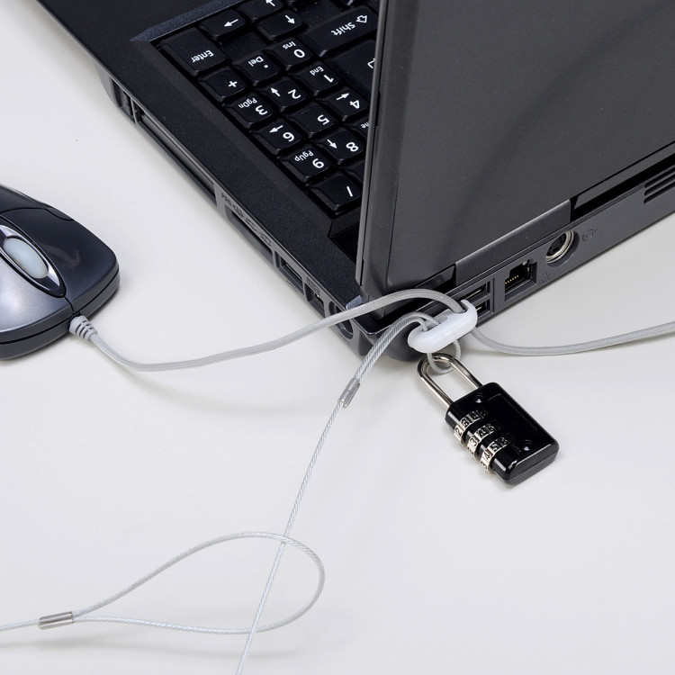 <使用方法> 1.取り付け部品Bをセキュリティスロットに差し込み90°回転させます。 2.部品Aにマウス、テンキーなどのケーブルを引っ掛けます。(※直径5mmまでのケーブルに対応) 3.部品Aを部品Bにかぶせます。 4.ワイヤーを机の脚などに巻き付けます。 5.部品A・Bの穴にワイヤーを通し、カギをかけます。※暗証番号を忘れてしまった場合は全ての番号を試すか、金具を切断する以外開錠はできません。メモなどを残すようにしてください。 |
