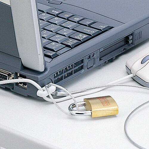| | 特長 | ●パソコンのセキュリティスロットを使って、マウスやテンキーなどの機器も同時に盗難から守ります。 ●パソコンを使った展示会などにも最適です。 <使用方法> 1.取り付け部品Bをセキュリティスロットに差し込み90°回転させます。 2.部品Aにマウス、テンキーなどのケーブルを引っ掛けます。(※直径5mmまでのケーブルに対応) 3.部品Aを部品Bにかぶせます。 4.ワイヤーを机の脚などに巻き付けます。 5.部品A・Bの穴にワイヤーを通し、カギをかけます。 |