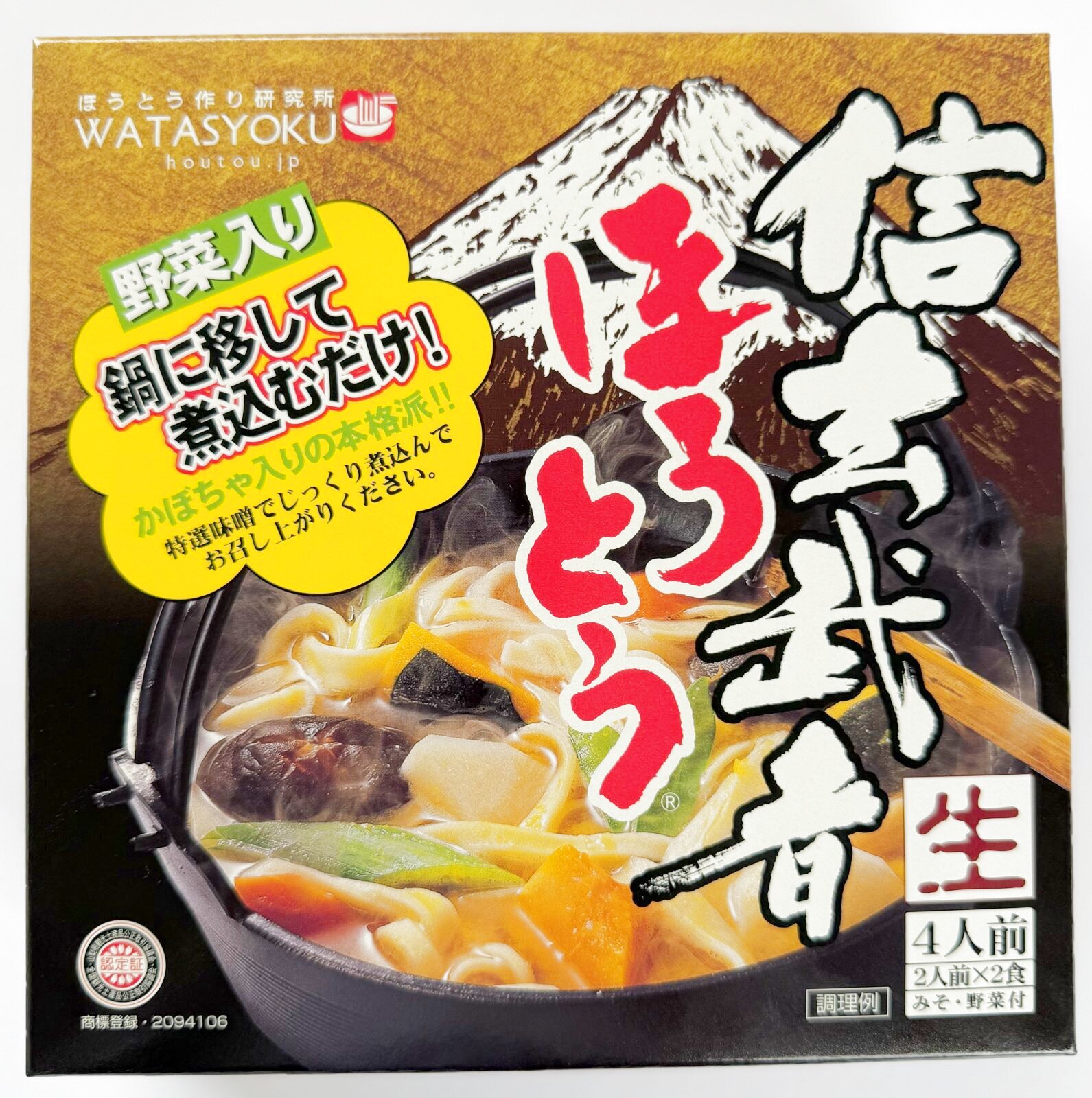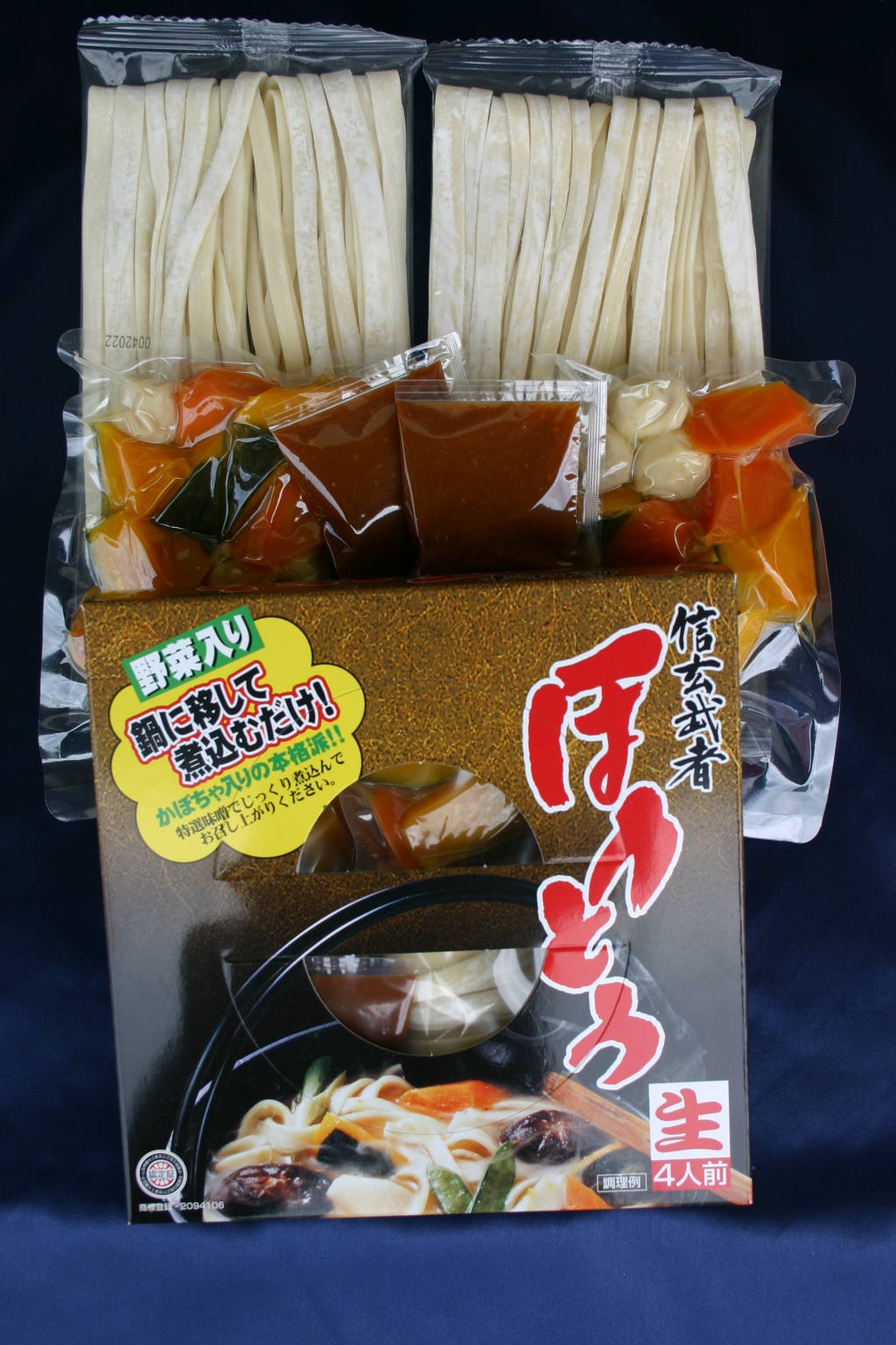 この1箱に4人前(2人前×2)入りです。めん、みそ、野菜が入っている優れもの。かぼちゃ、じゃがいも、人参、ごぼう入りの本格味!あとは、鍋に移して煮込むだけ!2袋づつ分かれてますので2人前を2回に分けても使えます。