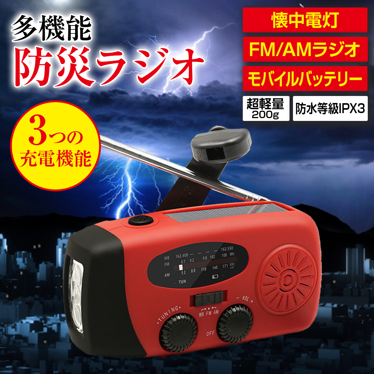 商品名:防災ラジオ 懐中電灯 モバイルバッテリー 多機能 手回し充電 スマホ充電 ソーラー FM AM 災害 停電 グッズ LED USB充電 ポータブル電源 防水