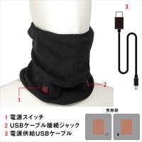 肌触りの良いフリース製の電熱ネックウォーマー。市販のUSB モバイルバッテリーを使用可能。パワースイッチの操作により3段階の温度調節が可能。