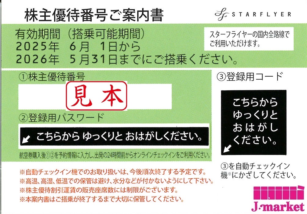 スターフライヤー(SFJ)株主優待券 番号通知可 2026年5月31日ご搭乗分まで