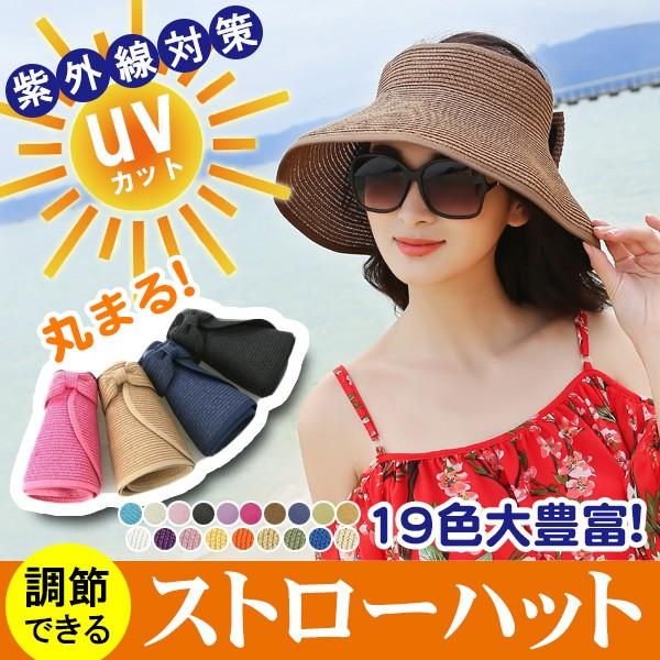 レディース ハット 丸まる コンパクト UVカット ストローハット 編み 日除け 紫外線対策 マジックテープ つば広 収納時の固定ゴム付き