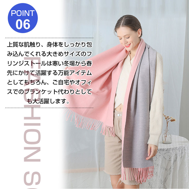 高級感あり!抜群な保温性!その日の気分やスタイリングに合わせて楽しむことができるリバーシブルタイプの大判ストールが登場!ねじって巻くと両側のカラーが見えます。カシミヤのようなしっとりなめらかな肌触りと優しい巻き心地。柔らかな起毛素材で暖かく、しっかり防寒!巻き方やアレンジも自由自在の大判サイズ!厚過ぎないほどよい生地感でいつものコーデにプラスするだけで、洗練されたコーデに!上質な肌触り、身体をしっかり包み込んでくれる大きめサイズのフリンジストールは寒い冬場から春先にかけて活躍する万能アイテムとしてもちろん、ご自宅やオフィスでのブランケット代わりとしても大活躍します。