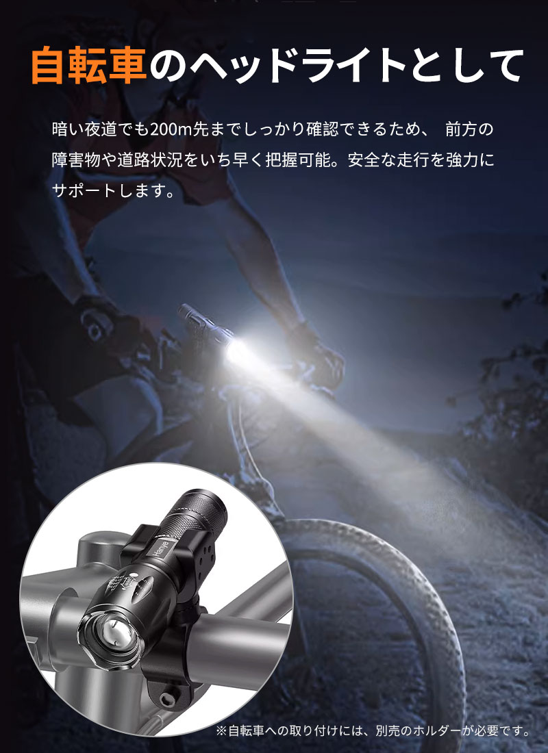 ■自転車のヘッドライトとして暗い夜道でも200m先までしっかり確認できるため、前方の障害物や道路状況をいち早く把握可能。安全な走行を強力にサポートします。