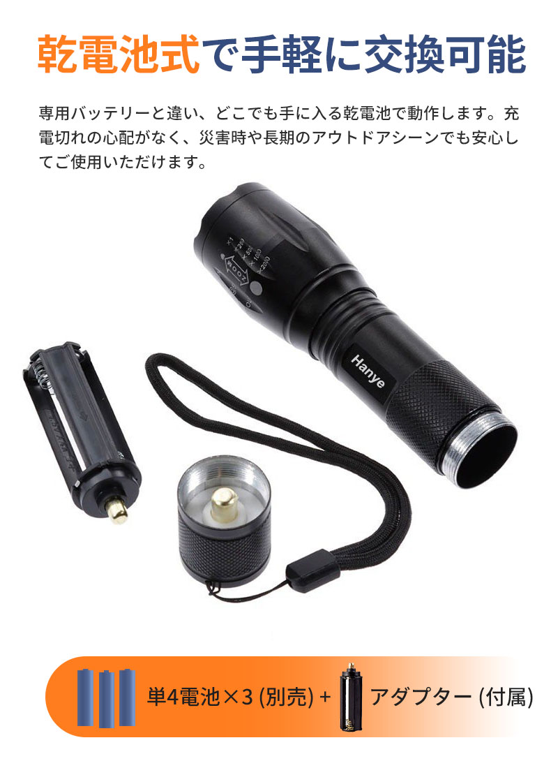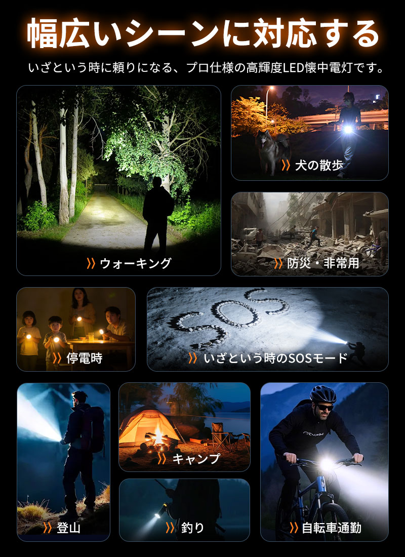 いざという時に頼りになる、プロ仕様の高輝度LED懐中電灯です。